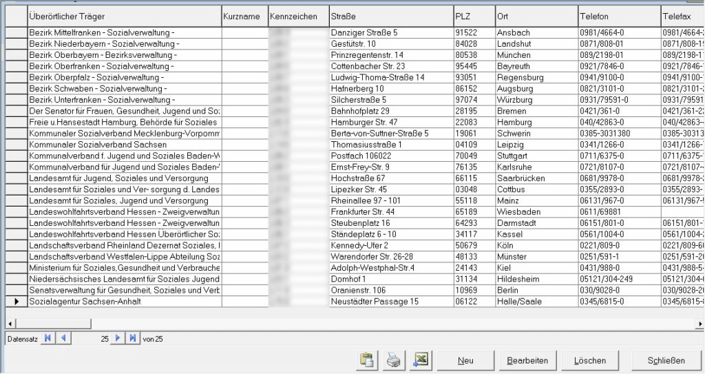 Die Verwaltung der Adressen der Sozialämter ist hier möglich.