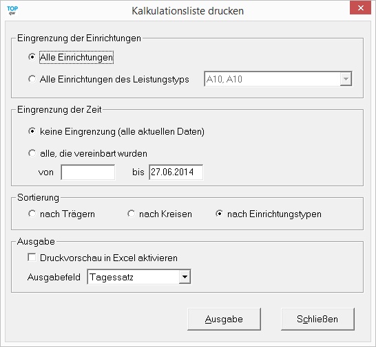 Die Kalkulationsliste gibt je nach Einstellung im nachfolgenden Formular die Kalkulation der Vergütungen in einer Liste in Microsoft Excel aus.