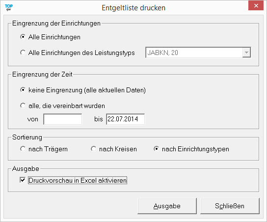 Bei der Definition der Suchparameter können Sie den Einrichtungstyp, die Hilfebedarfsgruppe, den Kreis, den Stichtag wählen. Darüber hinaus ist es Ihnen möglich zu entscheiden, ob es sich bei dem Stichtag um den der Vergütung oder der Vereinbarung handeln soll.