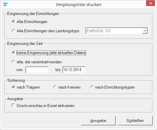Die Vergütungsliste gibt je nach Einstellung im nachfolgenden Formular die Vergütungen in einer Microsoft Excel-Liste aus.