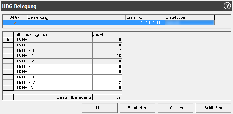 Belegung nach den HBG-StufenHinterlegen Sie hier die aktuelle Belegung der jeweilige Einrichtung, gegliedert nach den Hilfebedarfsgruppen.