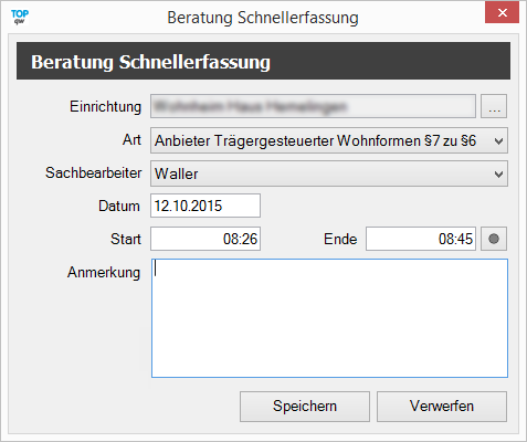 in der Symbolleiste erreichen Sie folgenden Dialog. Dieser ermöglicht es Ihnen schneller Einträge in dem Bereich Beratung der Wohn- und Betreuungsaufsicht zu hinterlegen. Dabei haben Sie den Vorteil innerhalb des Dialogs die Einrichtung und dessen Art auszuwählen/zu wechseln.