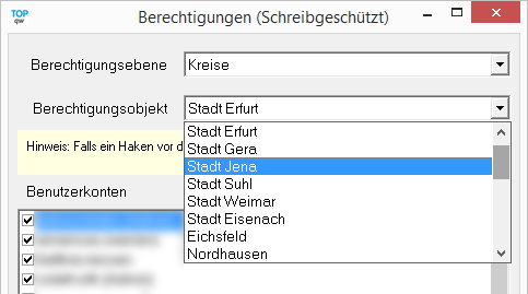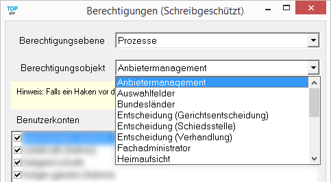 Überprüfen Sie, welcher Anwender für bestimmte Bereiche Berechtigungen besitzt. Dabei haben Sie die Möglichkeit nach Einrichtungstypen, Kreise, Prozesse und Stammdaten zu sortieren.