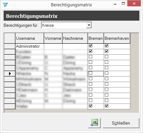 Diese Ansicht ermöglicht Ihnen eine Gesamtansicht der jeweiligen Berechtigungen Ihrer Mitarbeiter. Dabei können Sie die Einrichtungstypen, Kreisen und Prozessen nach den Berechtigungen filtern.