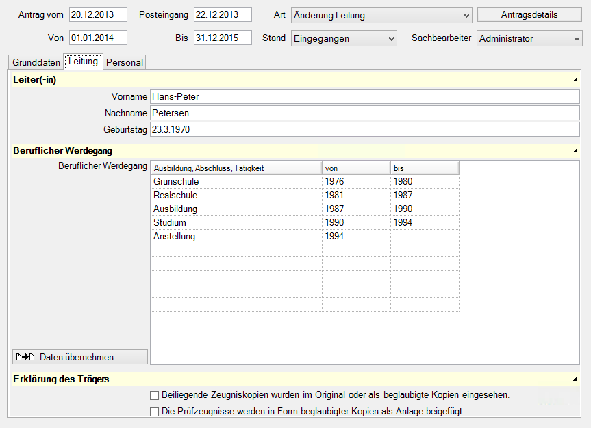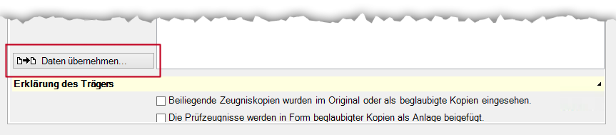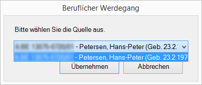 Sollte es innerhalb eines Trägers schon einen Beruflichen Werdegang geben, kann dieser über den Button Daten übernehmen… ausgewählt werden.