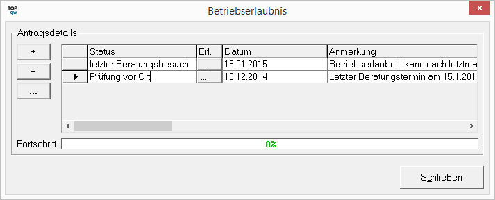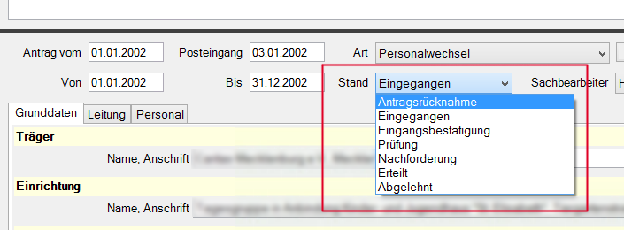 Felder der Betriebserlaubnis die nach der Vergabe des Stands Eingangsbestätigung noch editiert, werden gelb markiert.