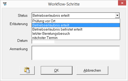 Wählen Sie ein vordefinierten Status und tragen Datum und Anmerkung ein. Mit OK bestätigen Sie die Eingabe.