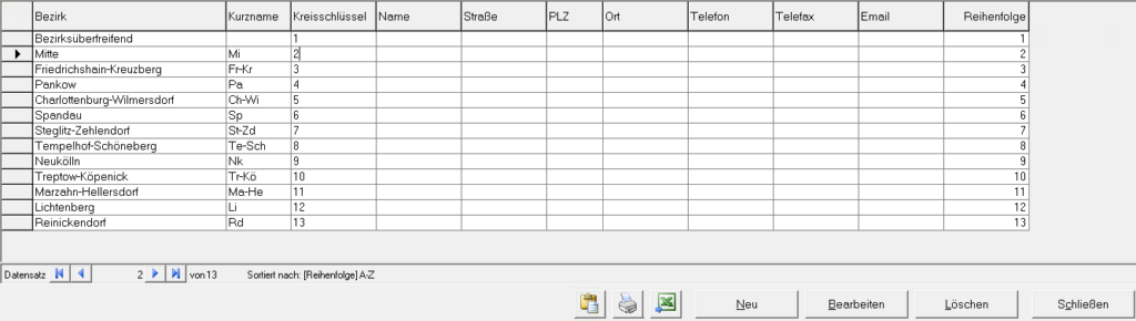 In dieser Ansicht werden die Bezirke Berlins und die dazugehörigen Kontaktdaten hinterlegt.