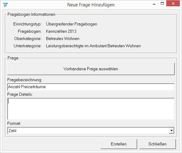 Sie können eine in dem Fragenpool Vorhandene Frage auswählen und diese als Grundlage wählen. Dazu klicken Sie auf den Button Vorhandene Frage auswählen. Das Texteingabefeld der Fragebezeichnung wird zu einer Auswahlliste, aus der Sie die gewünschte Frage über deren Fragebezeichnung auswählen können:Alternativ können Sie eine neue Frage erstellen, indem sie eine neue Fragebezeichnung selbst definieren. Die Fragedetails enthalten zusätzliche Informationen.Das Format bestimmt die Art der Frage. So werden die Formate kurzer und langer Text als Texteingabefelder dargestellt. Der Typ Ja/Nein als Auswahlkästchen zum AbHarken (Checkbox).
