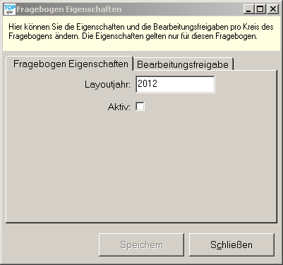 Im Formular der Eigenschaften des Fragebogens können Sie das Layoutjahr nachträglich ändern, den Bogen auf Aktiv schalten und die Bearbeitungsfreigabe nach Kreisen bzw. Bezirk setzen.