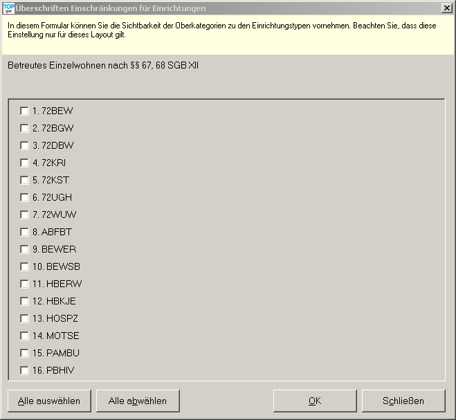 Entsprechend der Auswahl in dieser Auswahlliste werden die Oberkategorien nach Einrichtungstyp gefiltert ausgegeben.