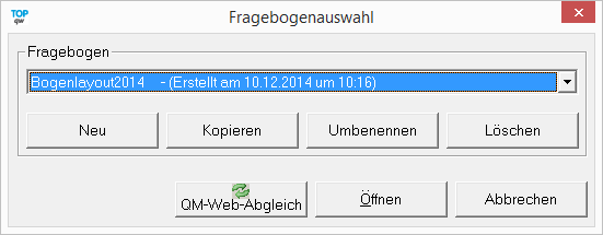Mittels der Fragebogenauswahl wird ein Layout ausgewählt, erstellt, bearbeitet oder gelöscht.