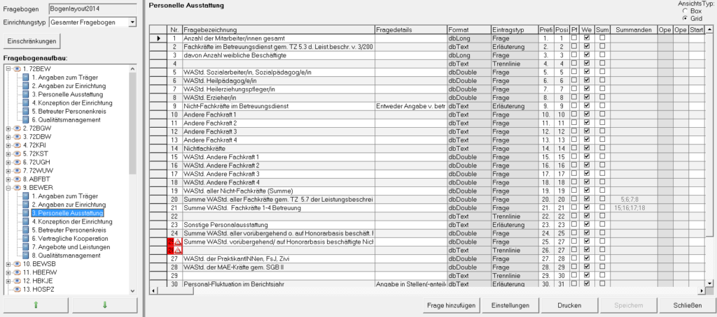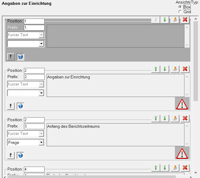 Zum einen gibt es eine tabellarische Grid-Ansicht, welche die Fragen der jeweiligen Unterkategorie in Tabellenform darstellt und zum anderen eine Box-Ansicht, die Angaben zu jeder einzelnen Frage in einem Rahmen gruppiert anzeigt.