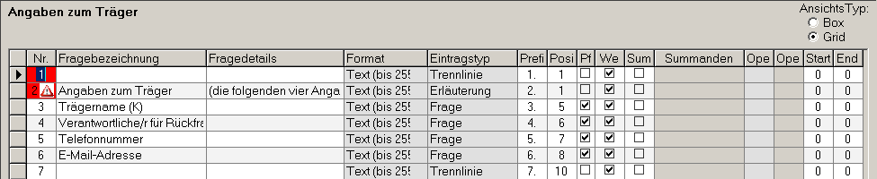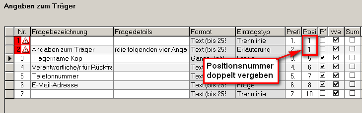 Fragen werden nach ihrer Positionsnummer sortiert. Diese darf innerhalb einer Unterkategorie nicht doppelt vergeben sein, da sonst Summanden und Operanden nicht korrekt zugeordnet werden können. Sollte eine Positionsnummer mehrfach vergeben sein, wird bei den betroffenen Fragen ein entsprechendes Symbol (