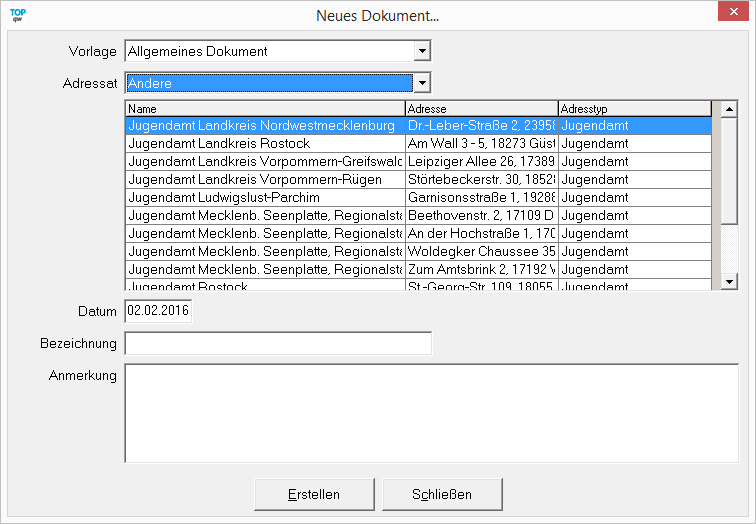 Erstellen Sie komplett neue Dokumente, die auf Grundlage einer Vorlage erstellt werden und beim Erstellen mit Informationen aus der TOPqw-Datenbank befüllt werden.