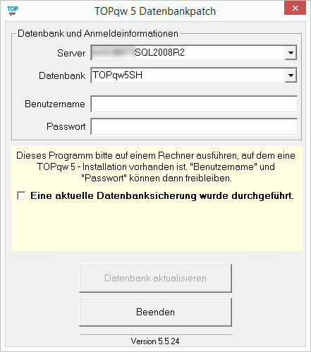 Das Update sollte nur ausgeführt werden, wenn der angemeldete Benutzer auch die Berechtigung des Datenbankinhabers (dbo) auf dem SQL Server besitzt. Die Gruppe der Administratoren, sofern unter diesem Account auch der SQL Server installiert wurde, hat diese Berechtigung automatisch.