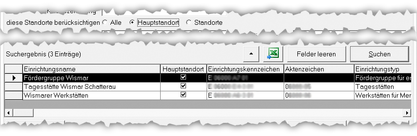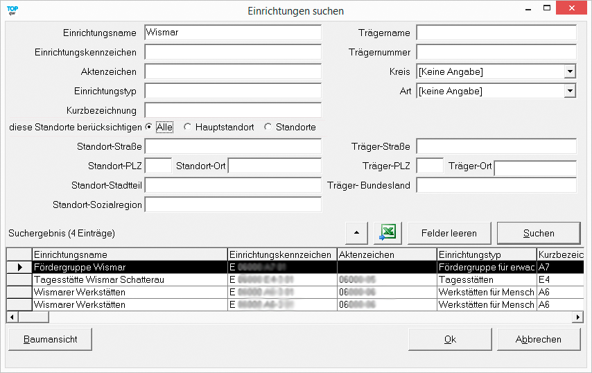 So können Sie z.B. durch Eingabe bei Einrichtungsname „Wismar“ alle Einrichtungen die „Wismar“ im Name haben suchen.
