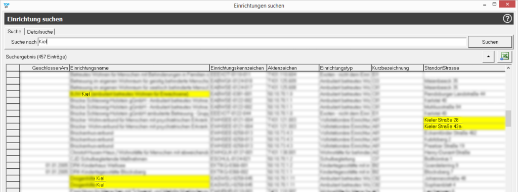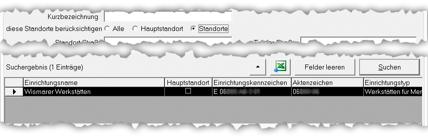 Die Erweiterte Suche erlaubt Ihnen z.B. nach Einrichtungen in bestimmten Kreisen oder auch einfach nach Fragmenten des Einrichtungsnamens zu suchen. Durch einen Doppelklick auf eine der gefundenen Einrichtungen gelangen Sie direkt zu den Stammdaten der Einrichtung.