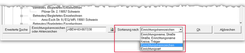 Im Einrichtungsfenster von TOPqw können Sie direkt durch Eingabe eines Aktenzeichens nach einer Einrichtung suchen.