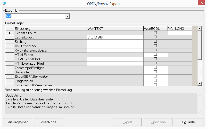 Die Einstellungen für den Export der Stamm- und Vertragsdaten nach OPEN / Prosoz sind kreisbezogen. Sie können hier die Ausgabe parametrisieren und Teile der Daten exportieren oder auch nur über eine Änderungsdatei ausgeben lassen.