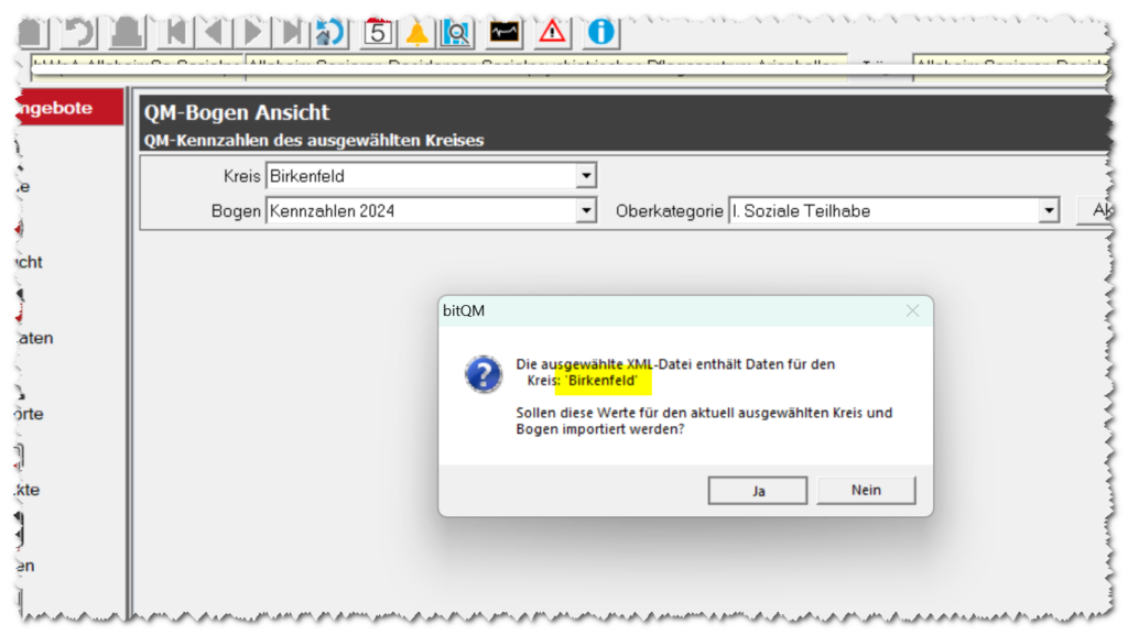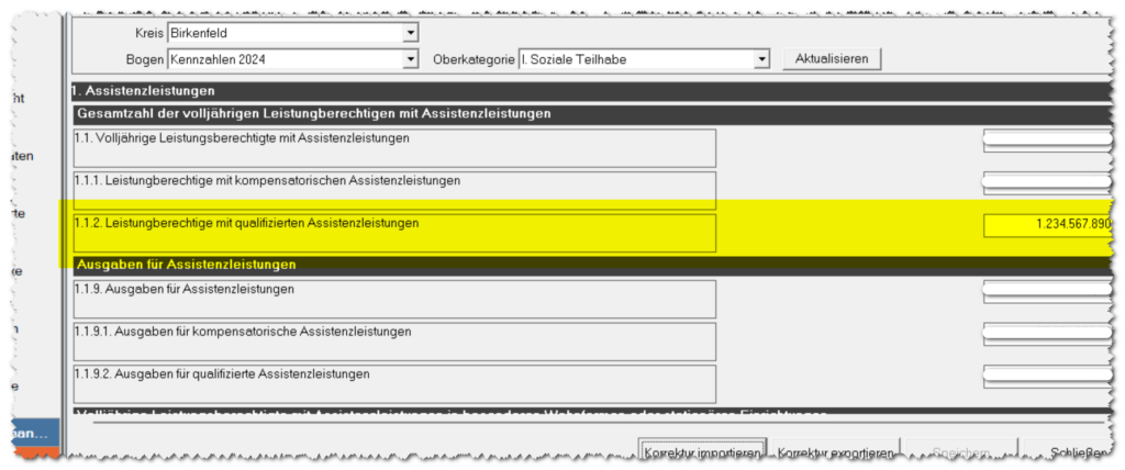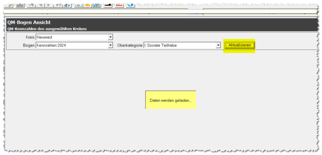 Nach erfolgreichem Import werden die Kennzahlen im QM-Bogen angezeigt. In den einzelnen Feldern der Unterkategorien (z. B. „1. Assistenzleistungen“) sind nun die aus der XML-Datei übernommenen Werte für den ausgewählten Kreis sichtbar. Über die Auswahl der Oberkategorie (z. B. „I. Soziale Teilhabe“) in der Kombinationsliste oberhalb des Bogens können weitere Bereiche angezeigt werden. Nach jeder Änderung der Oberkategorie muss die Schaltfläche „Aktualisieren“ betätigt werden, damit die zugehörigen Kennzahlen geladen und angezeigt werden.