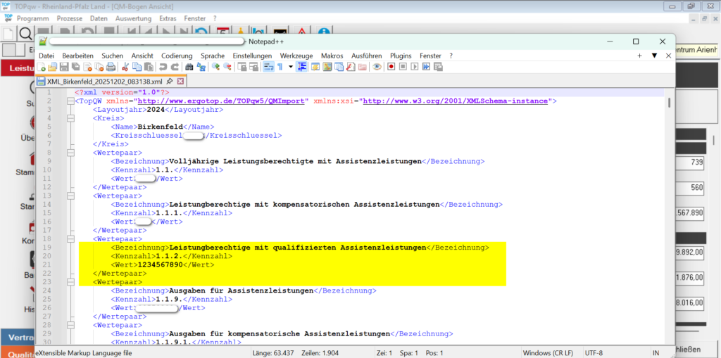 Es besteht zusätzlich die Möglichkeit, die in TOPqw vorliegenden Kennzahlen wieder als XML-Datei zu exportieren. Dies ist insbesondere dann sinnvoll, wenn Werte im QM-Bogen manuell angepasst oder ergänzt wurden. Die Daten werden dabei in einem XML-Schema ausgegeben, das dem von TOPqw erwarteten Aufbau entspricht, sodass die Datei bei Bedarf wieder in das Programm importiert werden kann.