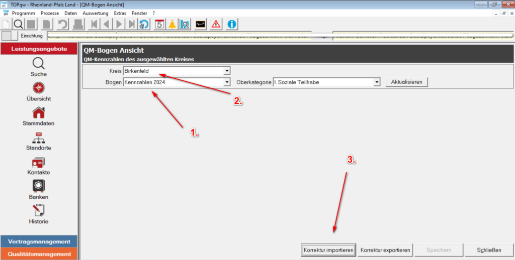 Um Kennzahlen zu importieren, wählen Sie in der Ansicht „QM-Bogen Ansicht“ zunächst unter „Bogen“ (1.) den gewünschten QM-Bogen aus, im Beispiel „Kennzahlen 2024“, und unter „Kreis“ (2.) den gewünschten Landkreis. Anschließend starten Sie den Import der gelieferten XML-Datei über die Schaltfläche „Korrektur importieren“ (3.).
