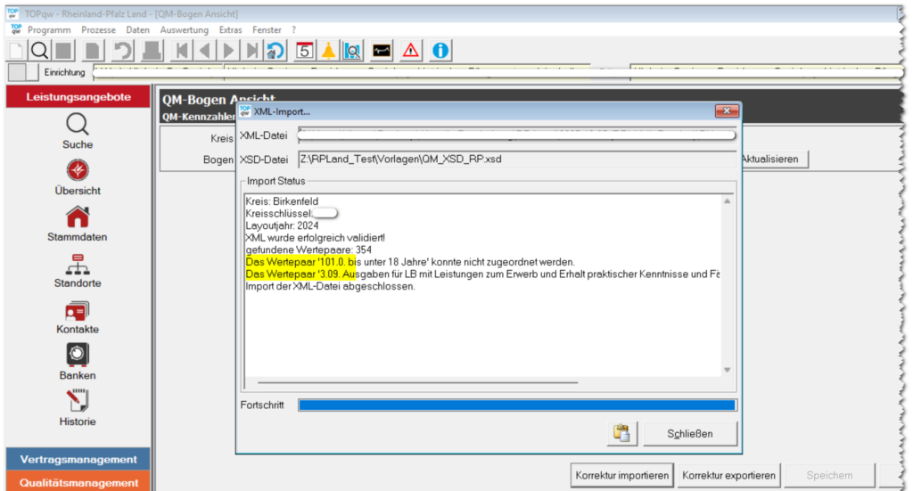 Während des Imports wird ein Protokollfenster angezeigt. Hier sehen Sie u. a. Kreisname, Kreisschlüssel, Layoutjahr und die Anzahl der gefundenen Wertepaare. Etwaige nicht zuordenbare Wertepaare werden im Protokoll angezeigt. Mit „Schließen“ beenden Sie den Vorgang, nachdem der Import der XML-Datei abgeschlossen wurde.