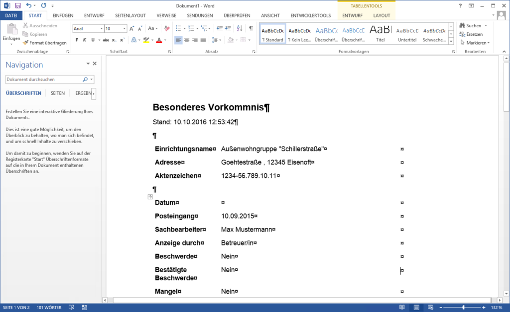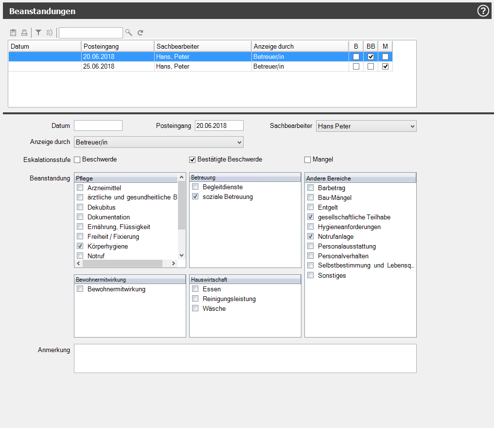 Definieren Sie u.a. die Art und die Eskalationsstufe der Beanstandung. Die Eskalationsstufe wird nach dem Speichern auch in der Übersicht durch Harken angezeigt.