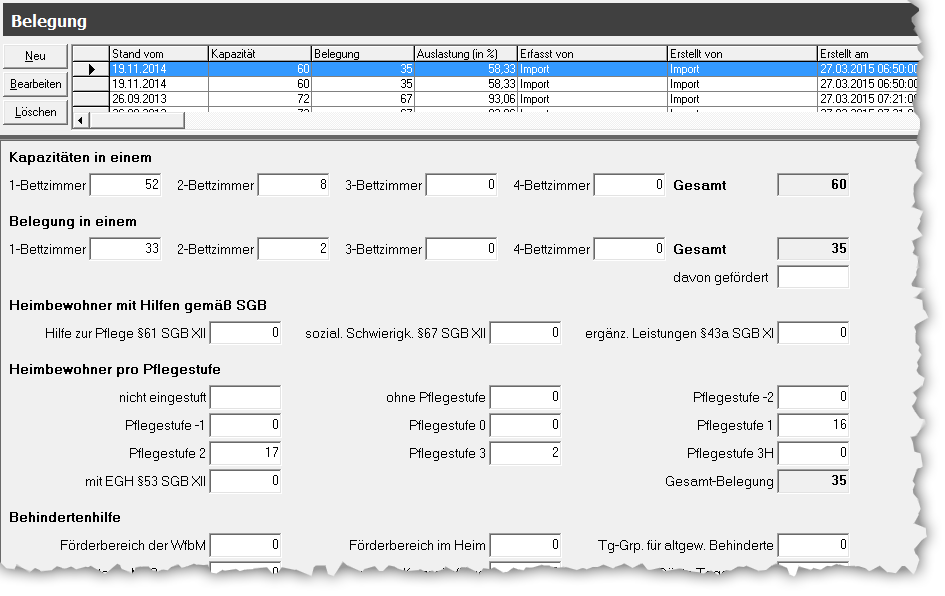 In der Auflistung der hinterlegten Belegungen erhalten Sie einen Überblick über die Entwicklung der Kapazität, der Belegung und der daraus folgenden Auslastung (in %).