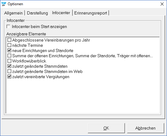 Auch die Einstellung, ob das Infocenter bei Start von TOPqw geladen wird können Sie hier einstellen.