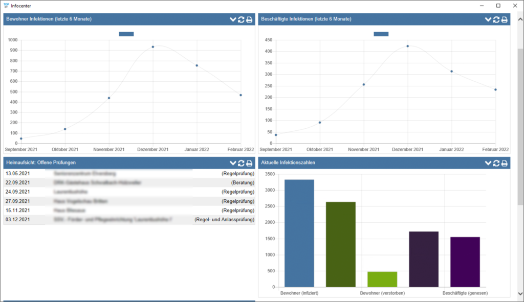Das Infektiongeschehen der COVID-19 Epidemie können Sie sich ebenfalls anzeigen lassen. Die Zahlen werden regelmäßig in der Heimaufsicht unter Infektionsschutz eingetragen.