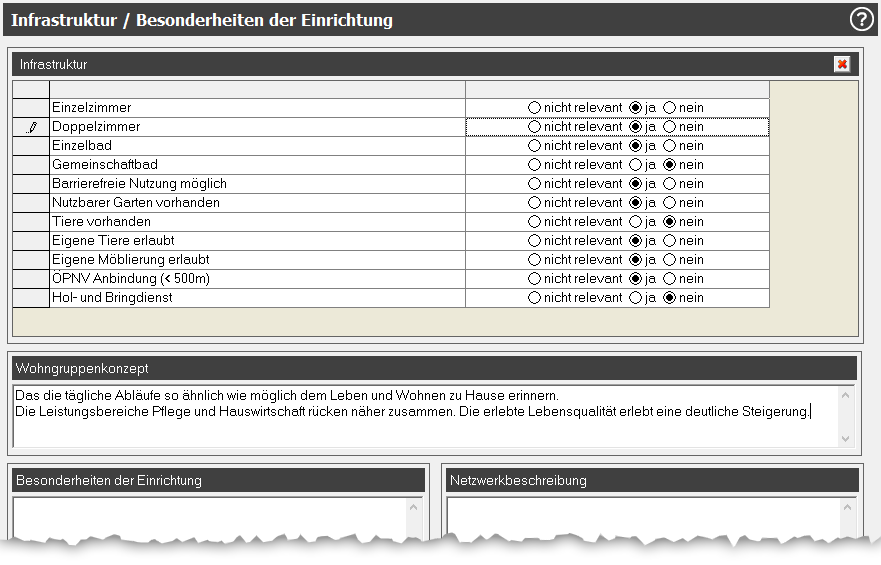 Dazu dienen Definitionen in der Infrastruktur und die Hinterlegung eines Wohngruppenkonzepts, Besonderheiten der Einrichtung und einer Netzwerkbeschreibung.