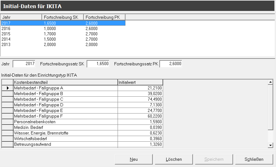 Dialog zur Verwaltung der Initial-Daten für IKITA