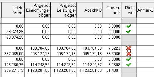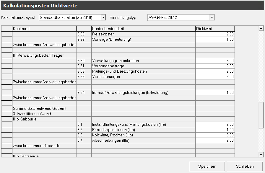 Für die unterschiedlichen Posten des jeweiligen Einrichtungstyps können Sie hier Richtwerte hinterlegen. Diese Richtwerte werden in der Vergütungsvereinbarung mit den dort hinterlegten Werten verglichen.