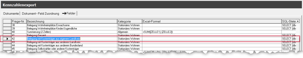 - Nun können Sie in der Tabelle nach dem Eintrag suchen, bei dem der falsche Wert ausgegeben wird. In diesem Beispiel suchen wir den Eintrag „Belegung mit Bewohnern in Kostenträgerschaft des eigenen Landkreises/der kreisfreien Stadt Eigenbelegung“ auf dem Arbeitsblatt „KeZa4-Kostenträger“. Am besten nutzt man parallel dazu die Excel-Vorlage um die genaue Spalte zu bestimmen. In diesem Fall ist das die Spalte „X“.