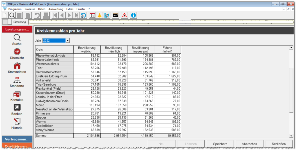 In der Ansicht „Kreiskennzahlen pro Jahr“ können die Kennzahlen der einzelnen Kreise und kreisfreien Städte für ein bestimmtes Jahr eingesehen und gepflegt werden. Angezeigt werden die Bevölkerungszahlen weiblich, männlich und insgesamt sowie die Fläche in km².