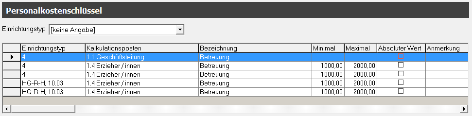 Definieren Sie die Personalschlüssel für die verschiedenen Einrichtungstypen. Dabei wählen Sie die Kalkulationsposten, die Bezeichnung, den Minimal- und Maximalwert und ggf. eine Anmerkung an.