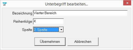 Definieren Sie den Namen, die Reihenfolge und Spalte in der dieser Unterbereich angezeigt werden soll.