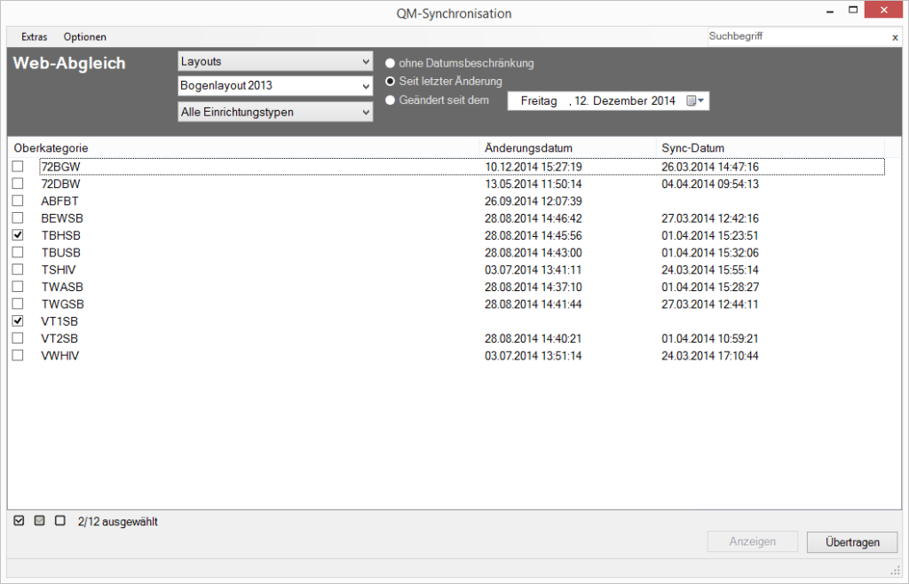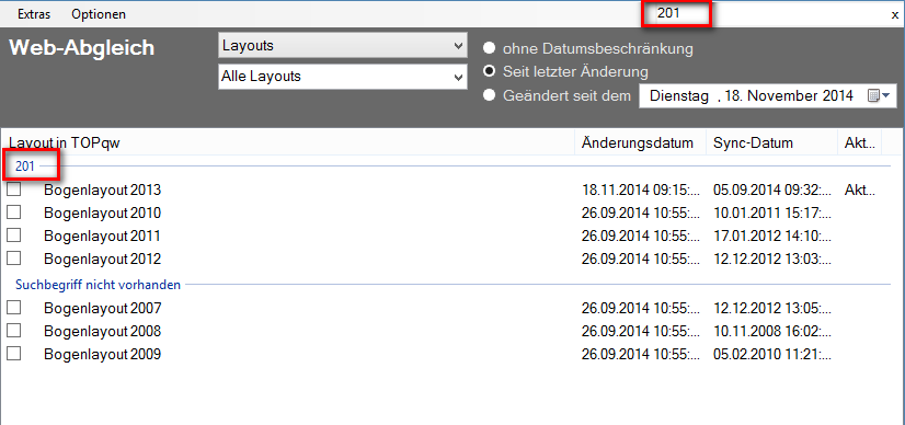 Es werden nur Einträge (Layouts/Bögen) angezeigt die entweder noch nie synchronisiert wurden, oder nach der letzten Synchronisation geändert wurden. Hier sehen Sie also nur geänderte Einträge (Layouts/Bögen).