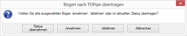 - Sie kreuzen die gewünschten Bögen auf der Seite von TOPqw Web an, und starten dann die Übertragung. Es öffnet sich ein Meldung mit der Sie alle gewählten Bögen „Akzeptieren“, „Ablehnen“, oder den aktuellem „Status übernehmen“ können.