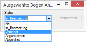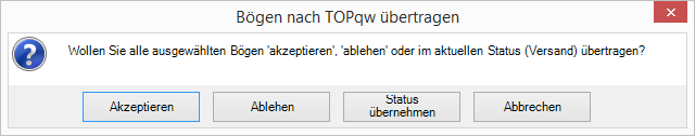 Auf beiden Seiten können Sie durch anHarken mehrere Bögen auswählen. Wenn Sie nun den Button Übertragen drücken, öffnet sich eine Messagebox mit der Nachfrage in welchem Status Sie die Bögen übertragen möchten.