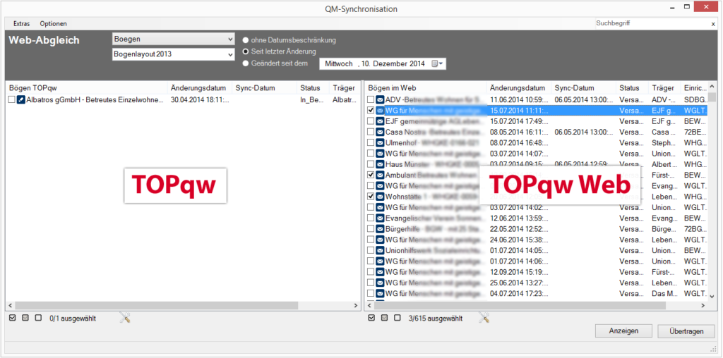 Wenn Sie in der QM-Ansicht den Status ändern, wird er nicht automatisch mit dem Web synchronisiert, eine Änderung muss explizit noch mit der QM-Synchronisation übertragen werden. Die so geänderten Bögen werden in der QM-Synchronisation auf TOPqw-Seite unter ‚Seit letzter Änderung‚ angezeigt.