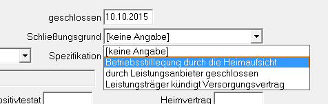 Wenn ein Datum im Feld geschlossen eingetragen wurde, können Sie eine Auswahl beim Feld Schließungsgrund treffen.