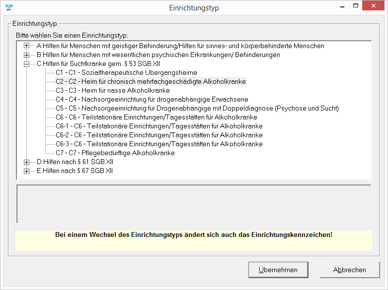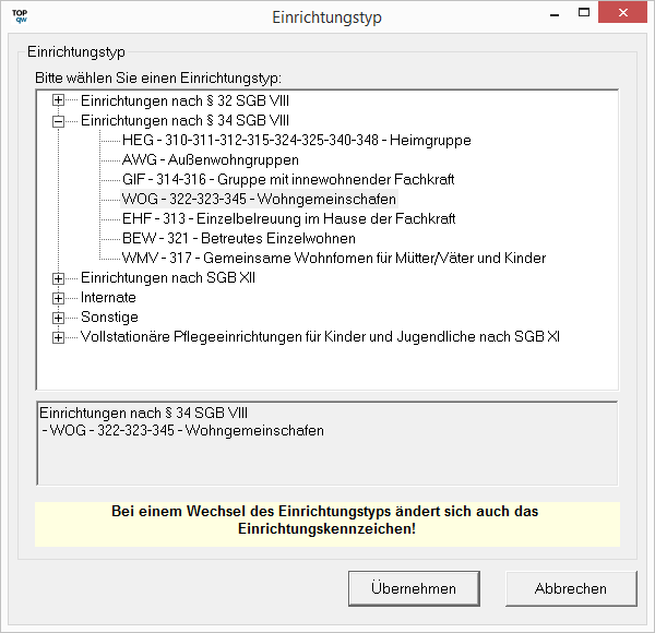 Bitte beachten Sie, dass ein Wechsel des Einrichtungstyps eine Änderung des Einrichtungskennzeichens mit sich bringt.