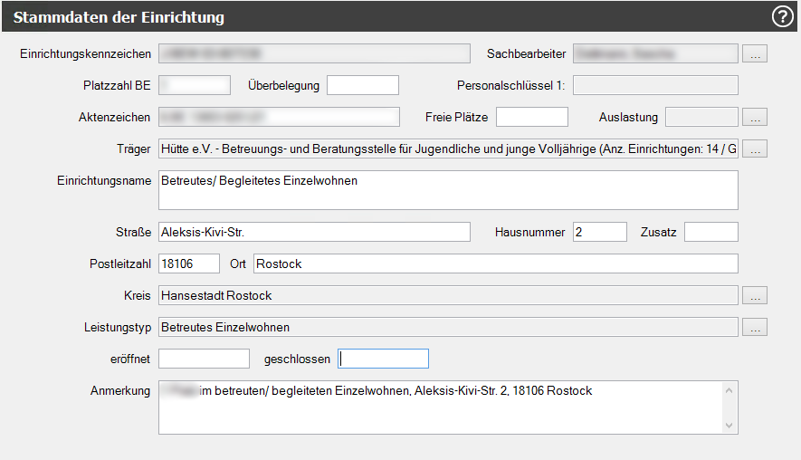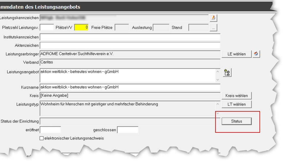 Die Änderung dieser Stammdaten können von Anwendern mit dem entsprechenden Recht durchgeführt werden. Neben den reinen Texteingabefeldern (weiße Felder) können Sie einige Informationen nur mit Hilfe von Dialogen ändern. Hierzu gehört z. B. die Wahl des Einrichtungs- / Leistungstyps oder des Trägers. Klicken Sie hierzu auf den entsprechenden Button.