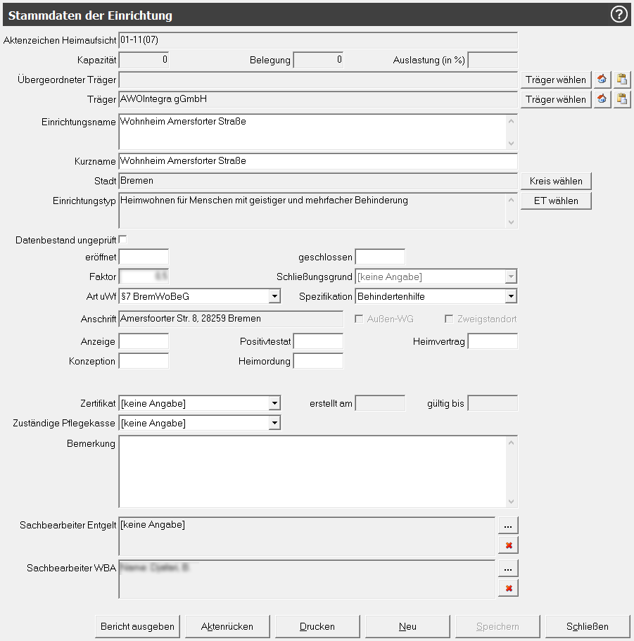 Ein speziell angepassten Dialog gibt es für die Wohn- und Betreuungsaufsicht. Sie erhalten die Möglichkeit zusätzliche Angaben zu tätigen. Darunter u.a. die Eintragung der Zuständigen Pflegekasse.