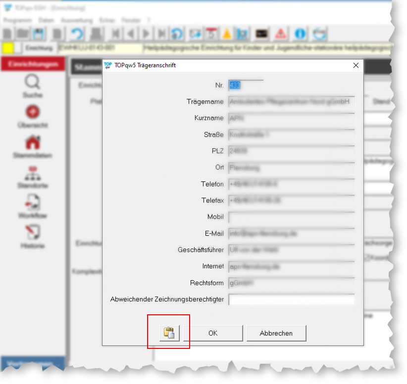 Die Adressdaten des übergeordneten Trägers und des Trägers lässt sich mit einem Klick auf das nebenstehende Symbol () in die Zwischenablage kopieren.