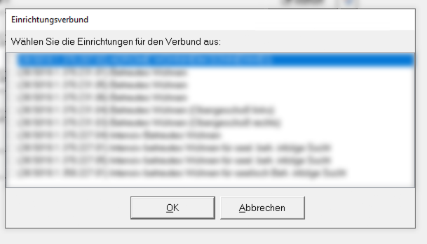 Nach einem Klick auf die Schaltfläche werden alle Einrichtungen des Leistungserbringers angezeigt. Durch das setzen eines Haken vor einem Leistungsangebot wird diese dem Verbund zugeordnet.