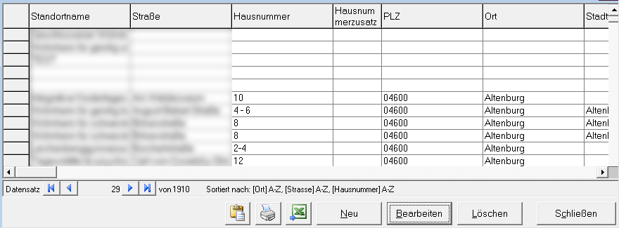 Sie erhalten hier eine Übersicht aller hinterlegten Standorte, so dass Sie an dieser Stelle, unabhängig von der gewählten Einrichtung, Änderungen an Standortadresse vornehmen können.